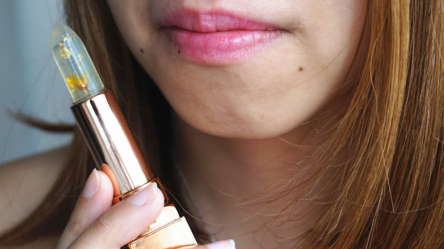 the GLAMFOX Fleurissant Lip Glow has a mini honey flower floating in within and it comes in a translucent colour. the lipstick itself is slightly wobbly hence it is not advice to expose the whole lipstick during application.